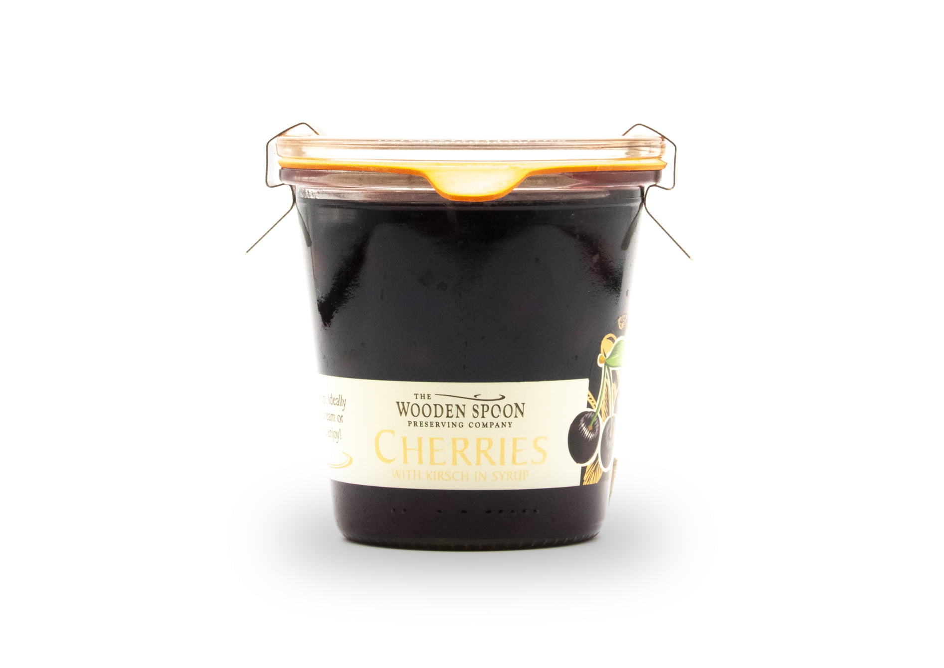 Plump, dark cherries steeped in fine Kirsch for a rich, aromatic preserve bursting with deep cherry sweetness and gentle almond notes.