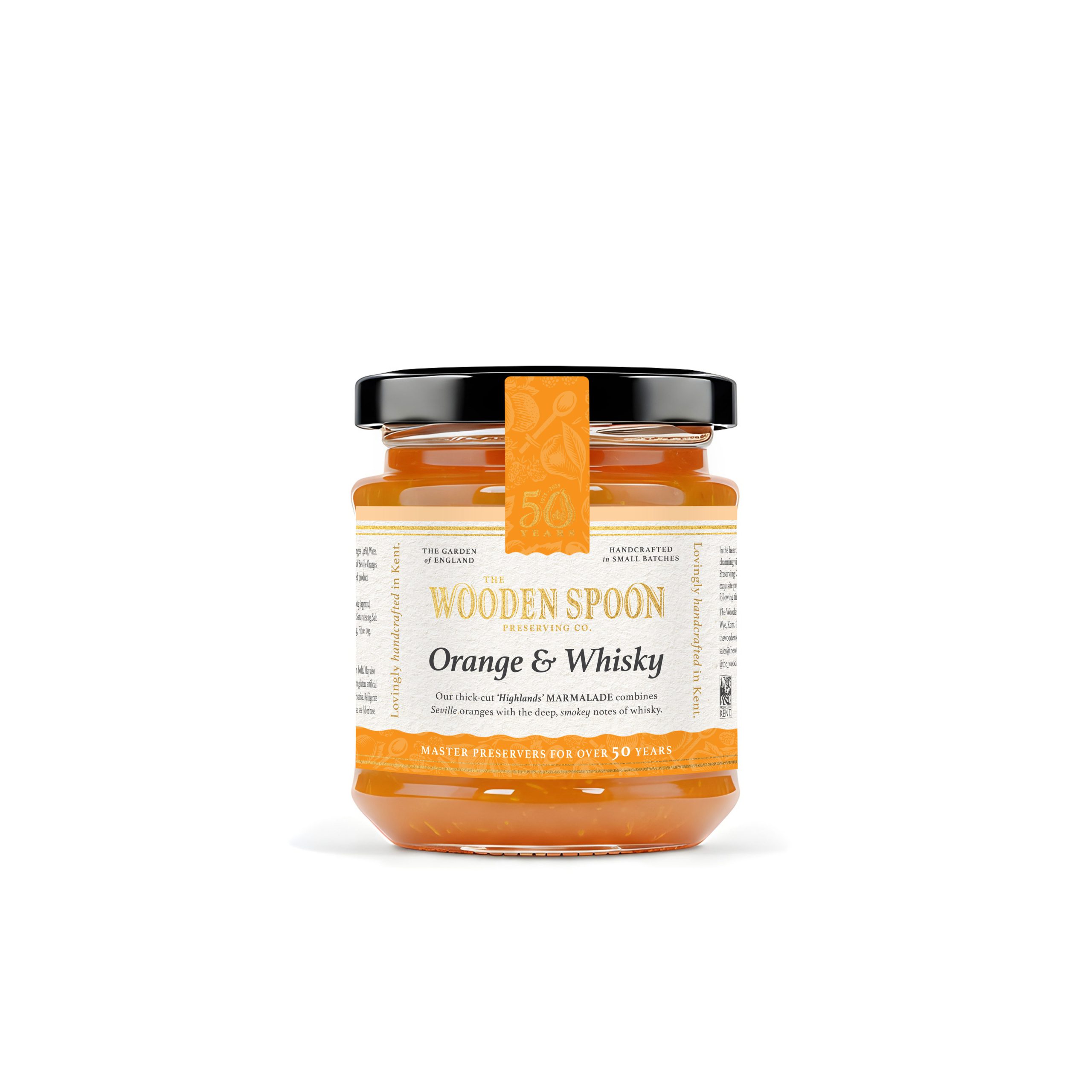 A warming marmalade where fine-cut Seville oranges meet a generous splash of Scottish whisky, giving a smooth citrus bite lifted by mellow, smoky notes.