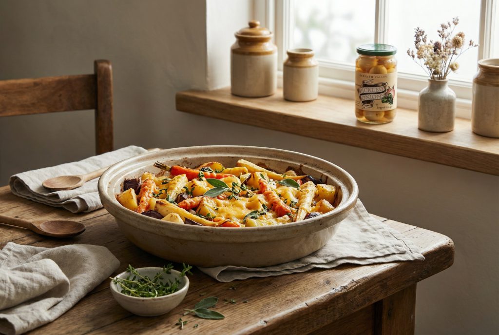 A hearty, warming dish that celebrates the tangy kick of Darenth Valley Pickled Onions alongside roasted winter vegetables and melting cheese — perfect for cold evenings.